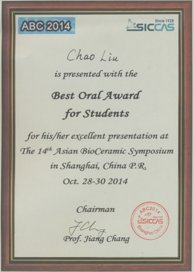 上海で開催された14th Asian BioCeramics Symposium (ABC2014)において,D2の劉超さんが優秀学生講演賞を受賞しました。