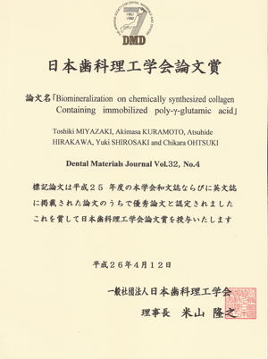 宮崎准教授が筆頭・責任著者である,下記の論文が日本歯科理工学会論文賞を受賞しました。この論文の内容は修了生の蔵本君,平川君の修士 論文研究に基づいています。