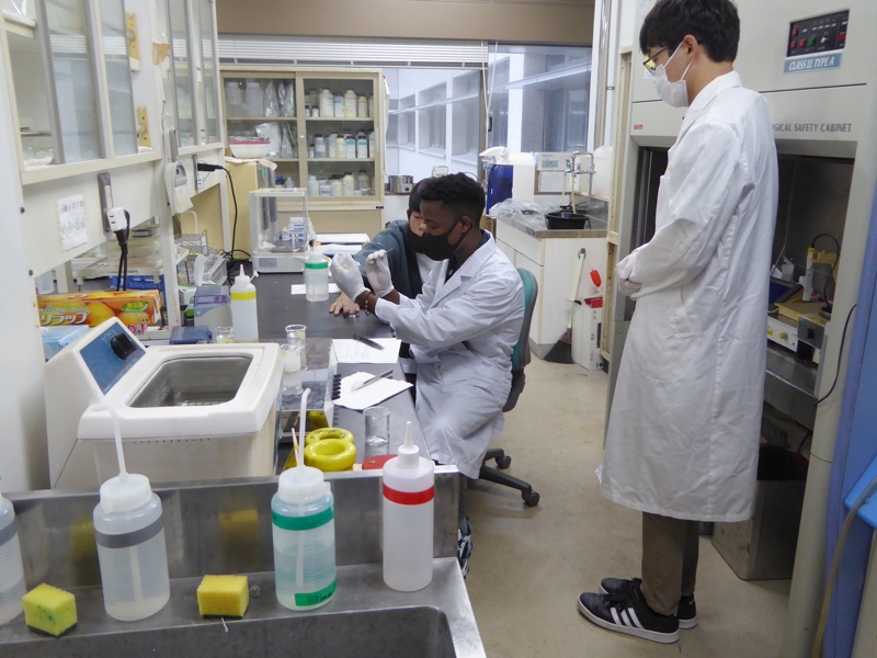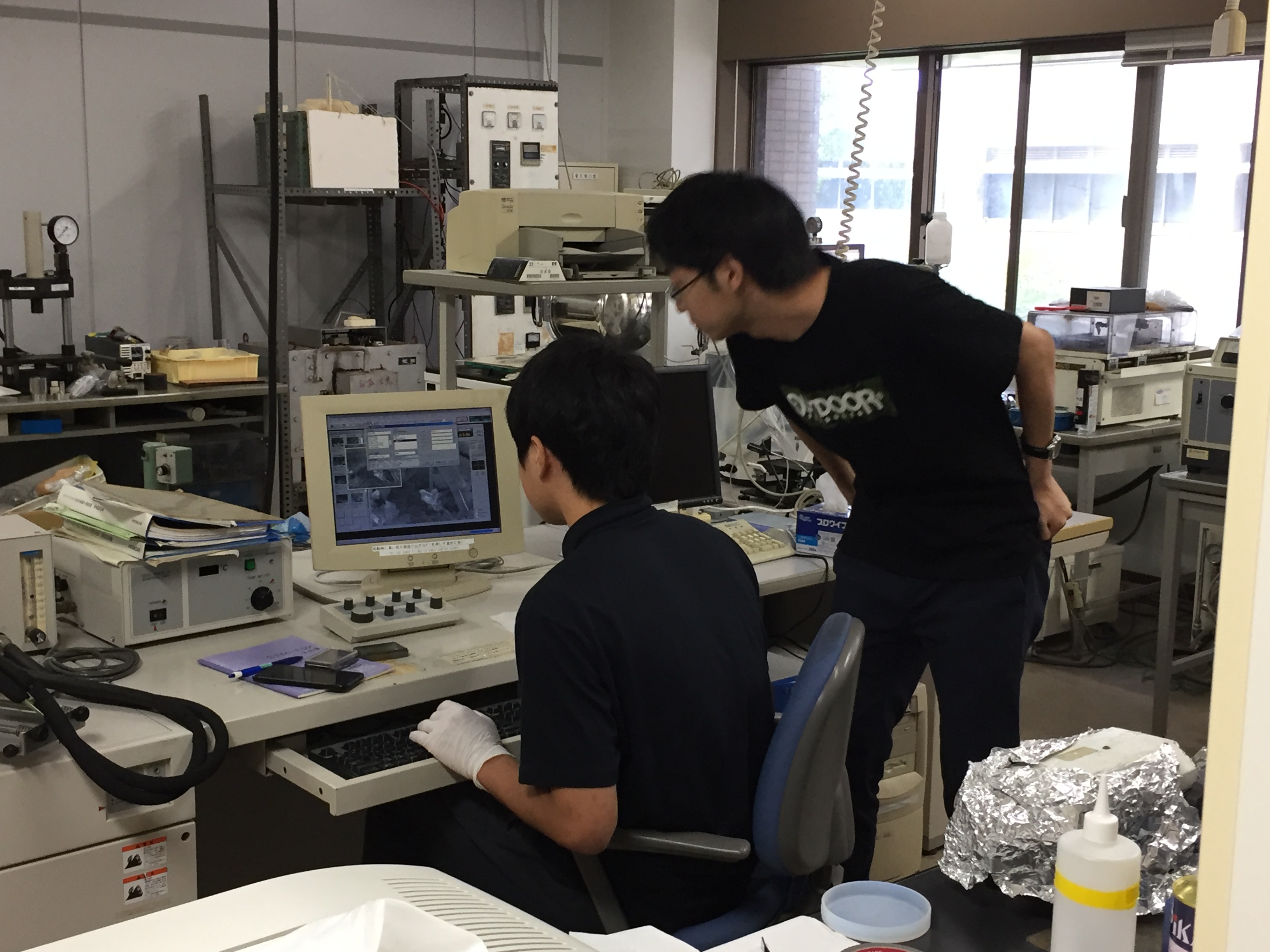 スーパーサイエンスハイスクール(SSH)の一環として,明治学園高校1年の生徒13名に本研究室へお越し頂き,講義と実習を行いました。生 体材料の講義,有機-無機 複合材料の作製,貝殻やウニ殻などの電子顕微鏡観察を通じて,材料科学やバイオミネラリゼーションに対する理解を深めました。