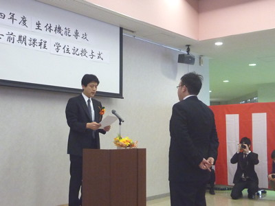 川上弘貴君の修士論文研究「耐摩耗性材料への生体活性の付与」が2012年度生体機能専攻 修士論文発表会において、優秀修士